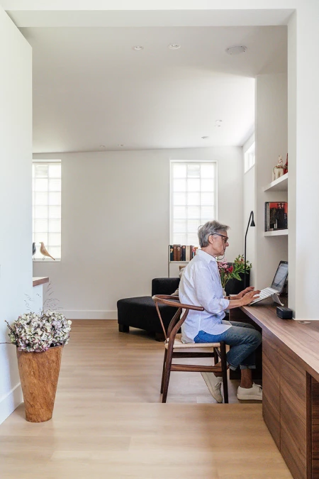 Lut e Luc vivono in una casa modernista a Mariakerke, un quartiere verde di Gand. La casa dei genitori di Luc è la loro casa di famiglia da 34 anni. La casa ha già subito diverse modifiche, l'ultima delle quali è stata la ristrutturazione della loro sala relax multifunzionale. Qui regnano tanta luce, i colori della terra e un senso di calma. Un luogo dove la coppia attiva può riprendere fiato.